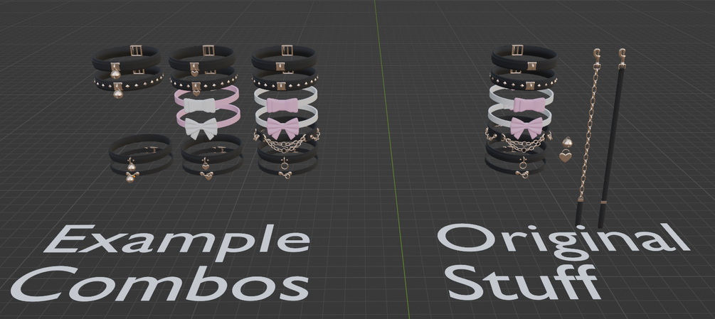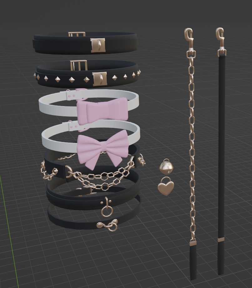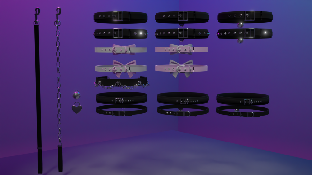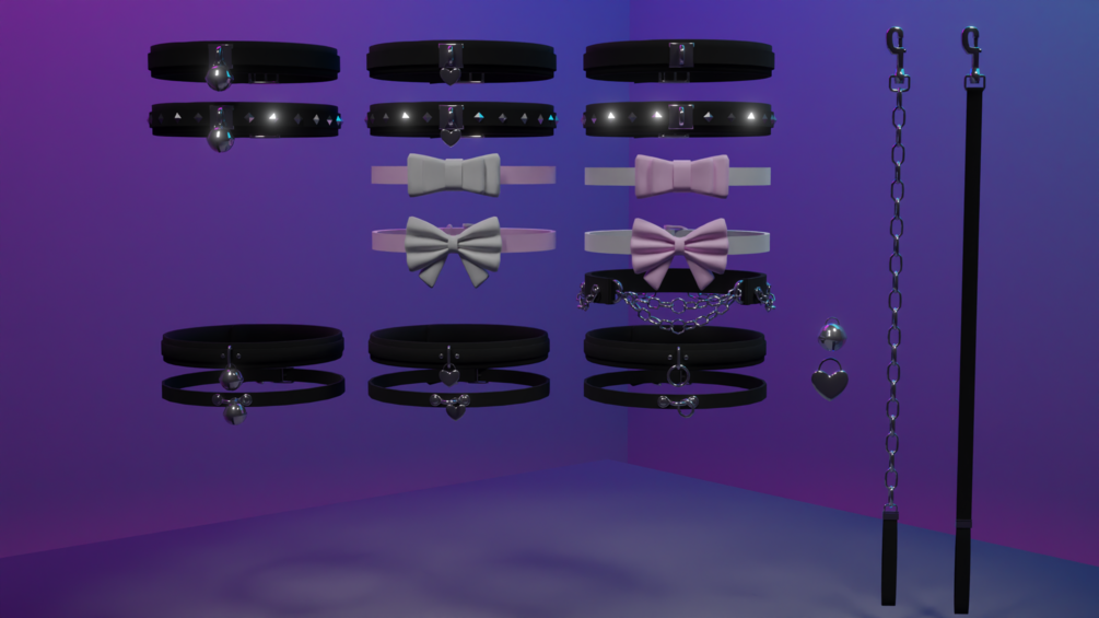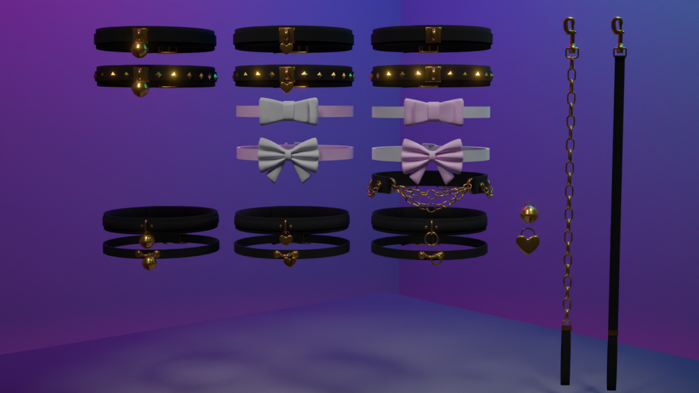 On the right are the original 7 collars, 2 leashes, a bell, and heart lock.