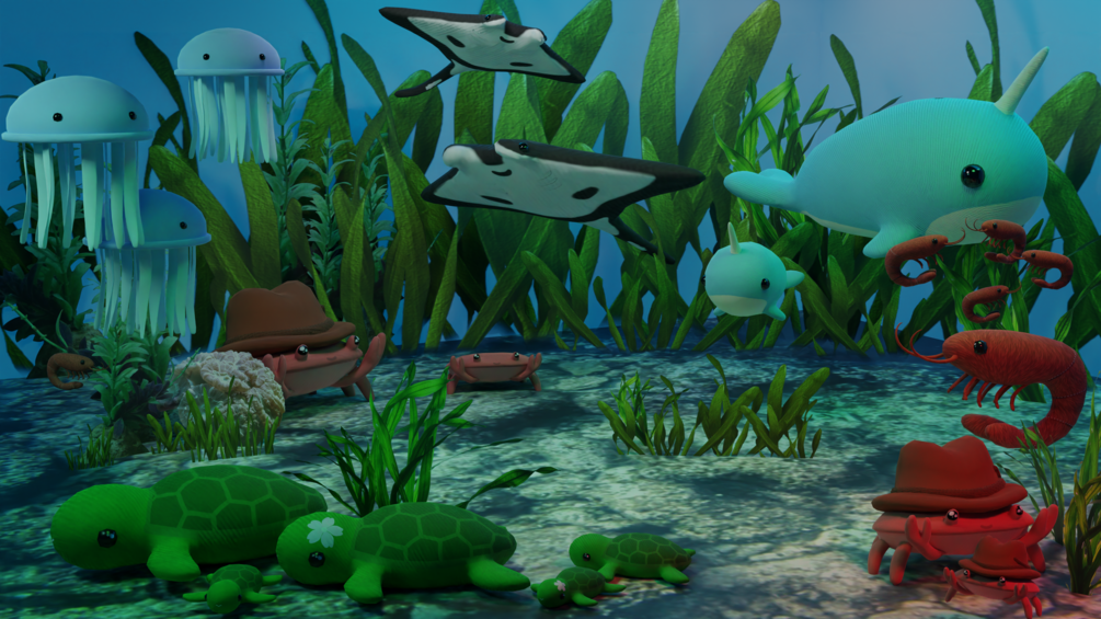 > Shrimp, Turtle, Narwhal, Manta Ray(rigged tail), Jelly Fish(rigged), Crab with a Cowboy Hat, Cowboy Hat